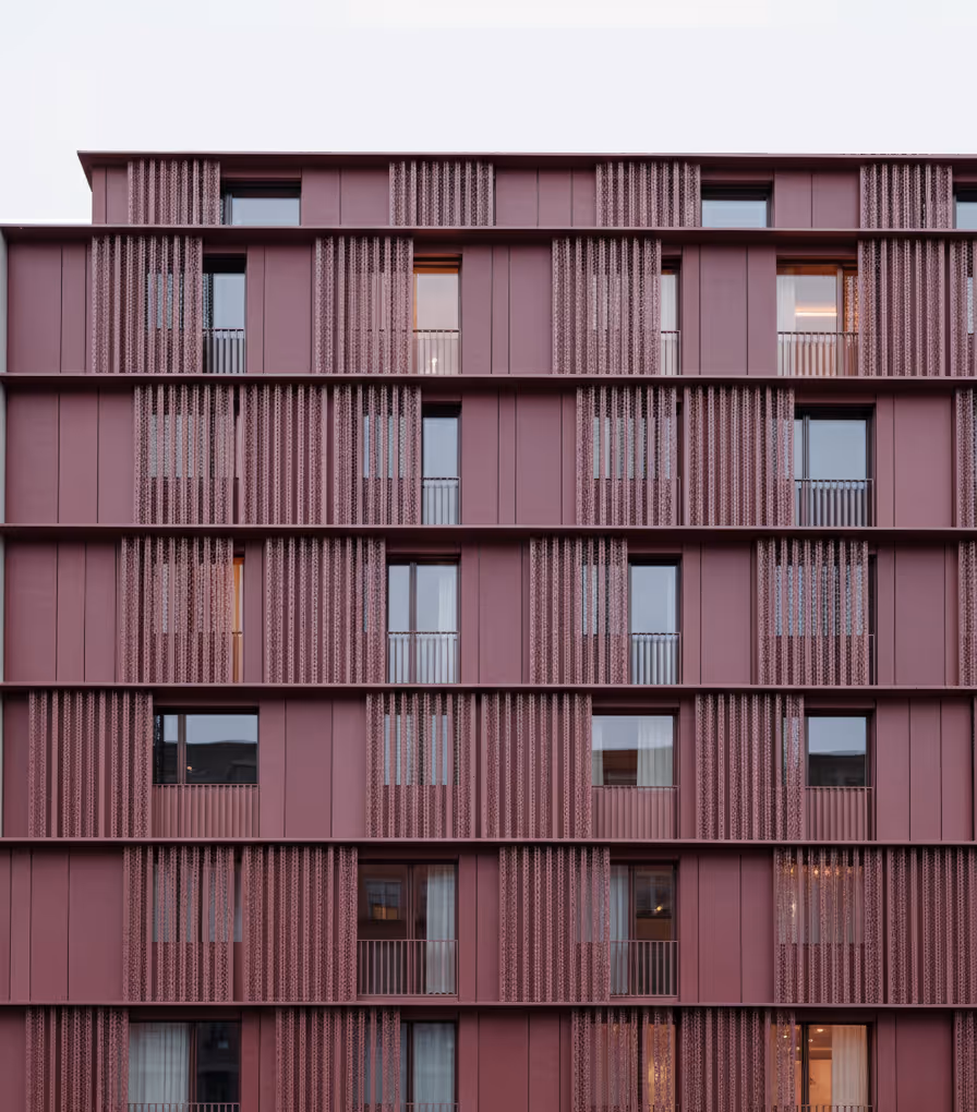 Each level is calibrated to resonate with the heights and geometries of adjacent façades. Floors three to five follow the cornice and eaves of the historic building, establishing a respectful dialogue with the past. Floors one to three align with the horizontal lines of the health office, forming a subtle urban connection. Above, the sixth and seventh floors recede — a gesture that lightens the mass, frames terraces, and mirrors the roofline of neighboring structures. Even the ground floor steps back, extending the public realm and creating a fluid threshold between building and street. At the city scale, The Link becomes a hinge — a measured composition that bridges eras, functions, and forms.